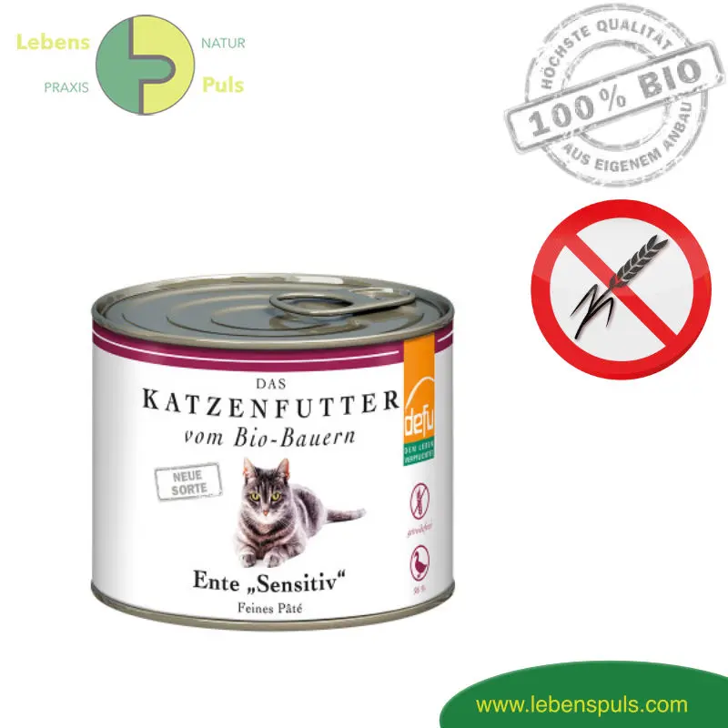 Pâté “Ente Sensitive”: Das Premium Katzenfutter Nassfutter getreidefrei BIO Ente ist eine feine Komposition aus 96 % Bio Ente, guten Bio Kürbissen und gesundem Sonnenblumenöl. Getreidefrei und glutenfrei ist sie das ideale tägliche Futter für Katzen, die zu Allergien bzw Unverträglichkeiten neigen. Sie enthält nur eine tierische Proteinquelle.